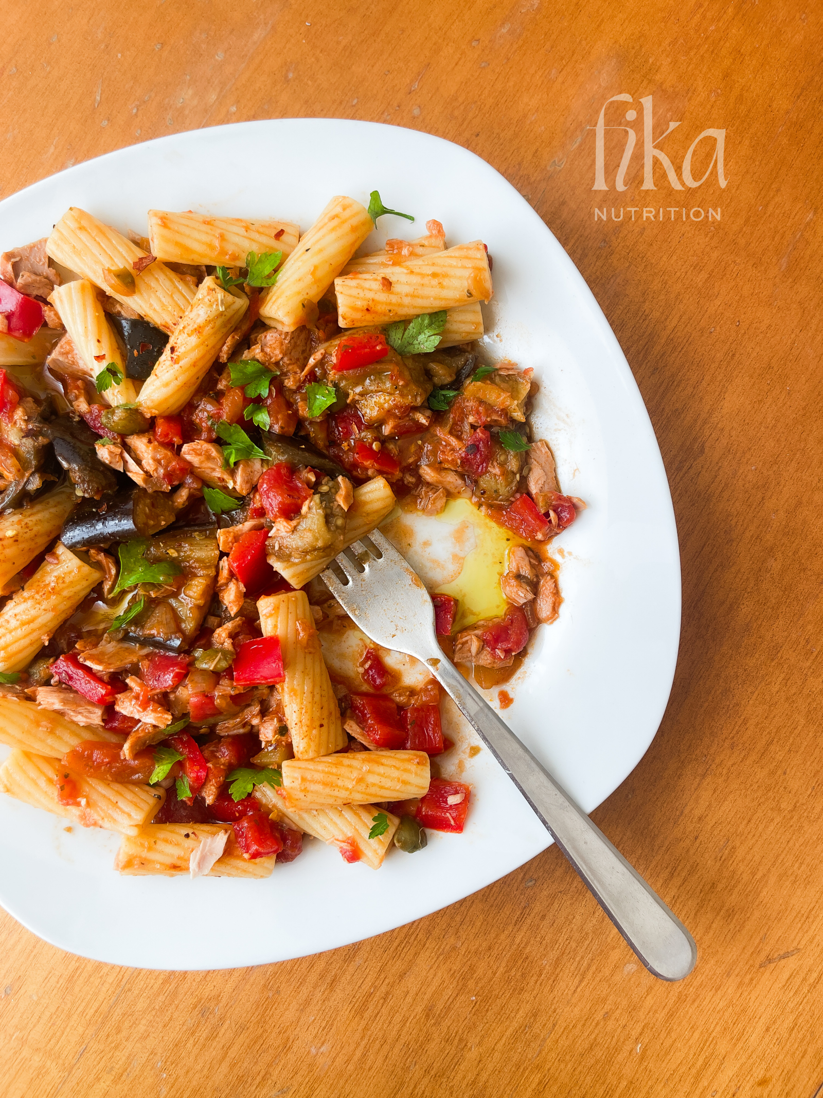 Add the pasta back to the same pot along with your caponata mix & a little of the pasta water. Mix well adding more of the water and seasoning if needed. - Top with tuna and fresh parsley!
