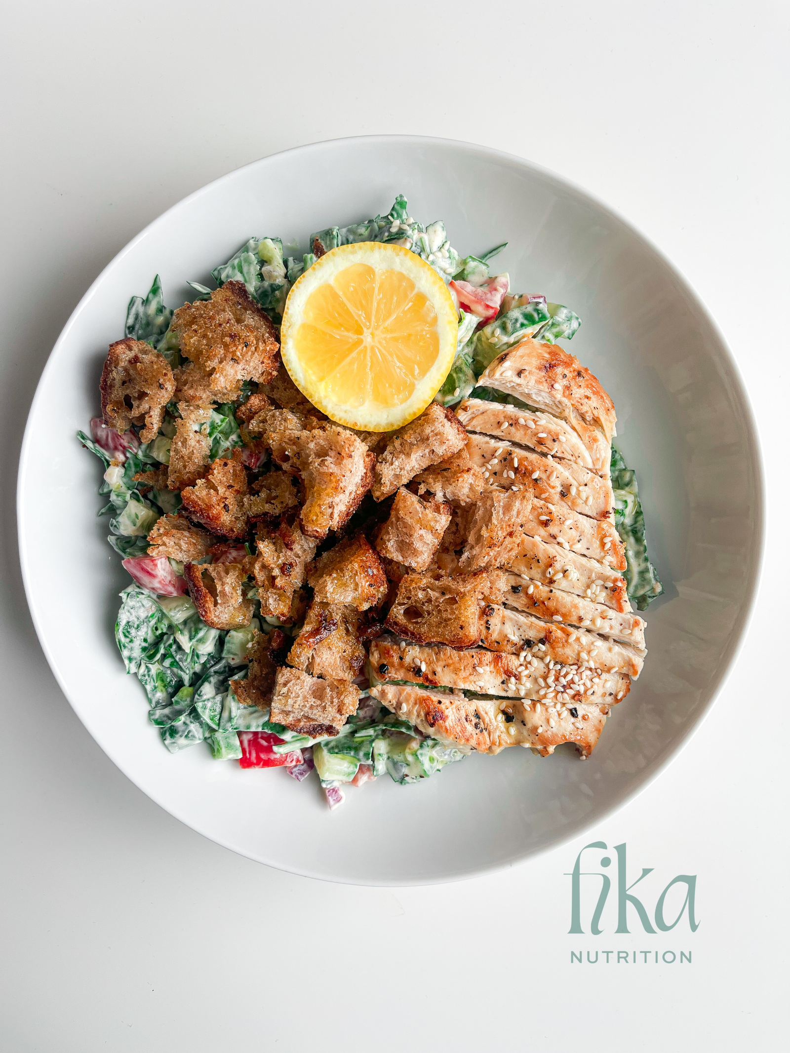 - Serve your salad in a bowl, slice up your chicken and add your bread cubes on top finishing with a sprinkle of sesame seeds