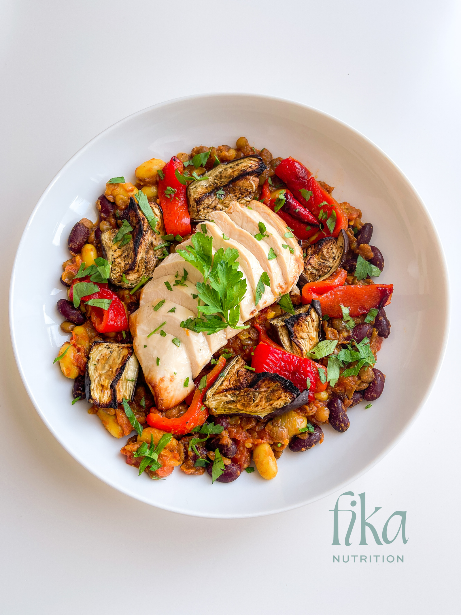 - Throw your cooked chicken & veg (if you’ve made the roast veg) in now and heat in the mix for 2 mins.